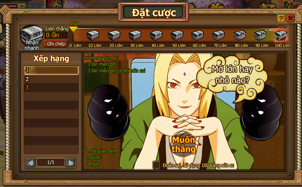 2. Thi đấu bắt đầu khi người chơi điểm số mình lớn hơn hay nhở hơn điểm của Tsunade, nhấn vào nút Lớn hoặc Nhỏ.