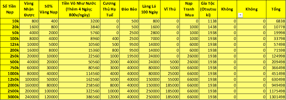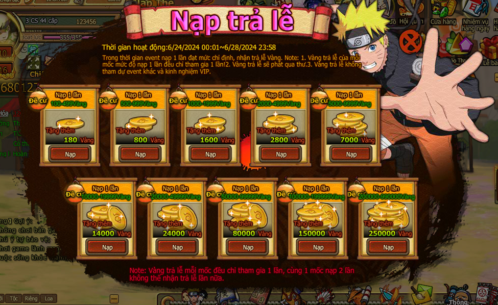 Trong thời gian event nạp 1 lần đạt mức chỉ định , nhận trả lễ vàng
