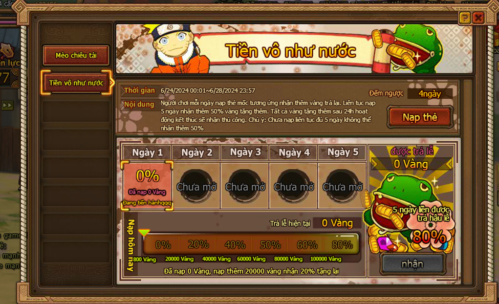 1. Người chơi mỗi ngày nạp thẻ mốc tương ứng nhận thêm vàng trả lại. Liên tục nạp 5 ngày nhận thêm 80% vàng tặng thêm. Tất cả vàng tặng thêm sau 24h hoạt động kết thúc sẽ nhận thủ công. Chú ý: Chưa nạp liên tục đủ 5 ngày không thể nhận thêm 80%.