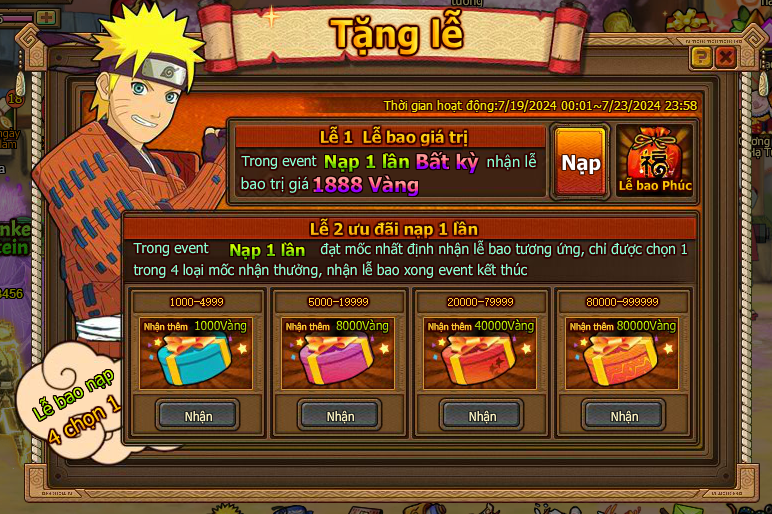 Trong thời gian event nạp 1 lần đạt mức chỉ định , nhận trả lễ vàng