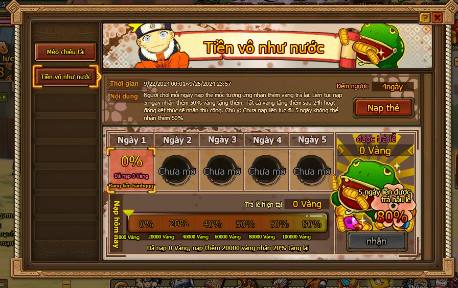 1. Người chơi mỗi ngày nạp thẻ mốc tương ứng nhận thêm vàng trả lại. Liên tục nạp 5 ngày nhận thêm 80% vàng tặng thêm. Tất cả vàng tặng thêm sau 24h hoạt động kết thúc sẽ nhận thủ công. Chú ý: Chưa nạp liên tục đủ 5 ngày không thể nhận thêm 80%.