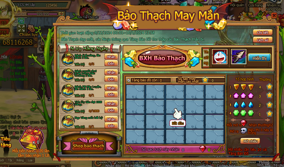 7. Sau khi event kết thúc toàn bộ Sao May Mắn chưa tiêu sẽ mất, đổi kịp thời. Ghi nhận xếp hạng Bảo Thạch là số Sao May Mắn cao nhất, ở shop bảo thạch dùng Sao May Mắn để đổi đạo cụ không ảnh hưởng ghi nhận số Sao May Mắn cao nhất.