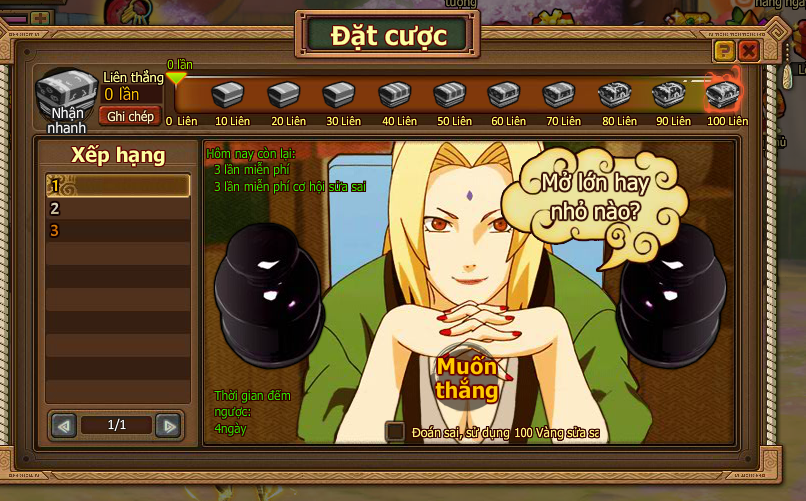 2. Thi đấu bắt đầu khi người chơi điểm số mình lớn hơn hay nhở hơn điểm của Tsunade, nhấn vào nút Lớn hoặc Nhỏ.