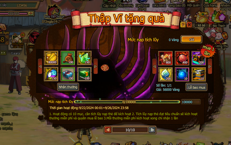2. Sau khi nạp đủ mốc tương ứng, nhận thưởng Tộc Otsutsuki, nếu chưa nhận thưởng, không thể tăng số lượng Huyết Kế.