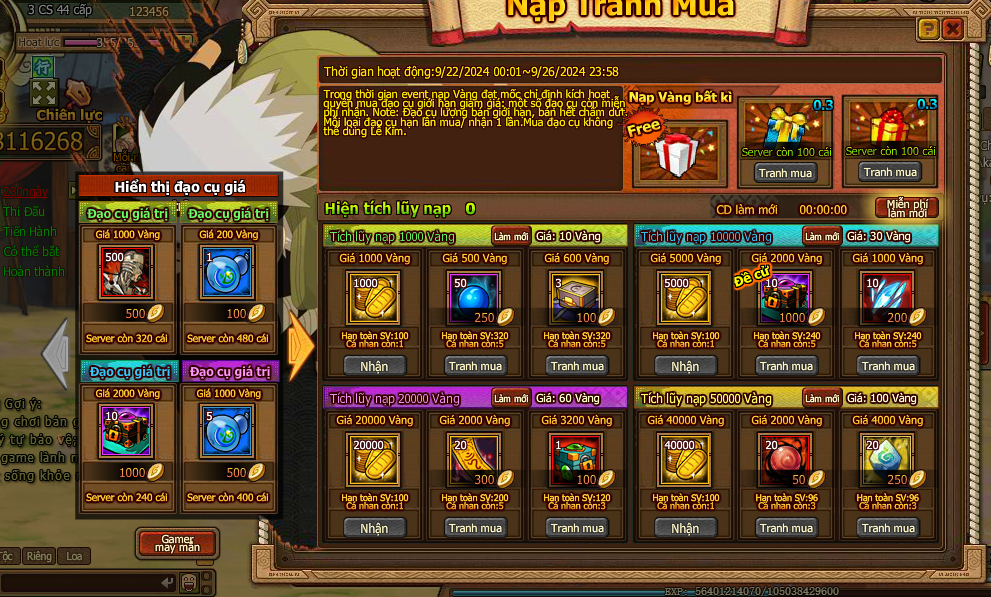 1. Trong thời gian event nạp Vàng đạt mốc chỉ định kích hoạt quyền mua đạo cụ giới hạn giảm giá: một số đạo cụ còn miễn phí nhận.