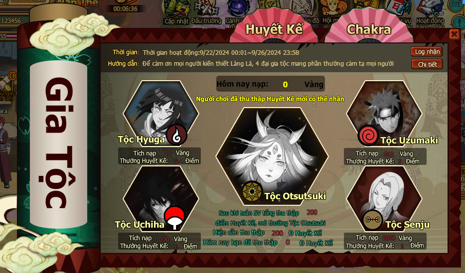 5. Mỗi ngày nhận tối đa 4 loại, cách ngày 0h làm mới, Liên SV thu thập lượng "Huyết Kế" làm mới, trạng thái nhận đại LB Tộc Otsutsuki ở giữa làm mới.