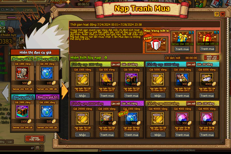 1. Trong thời gian event nạp Vàng đạt mốc chỉ định kích hoạt quyền mua đạo cụ giới hạn giảm giá: một số đạo cụ còn miễn phí nhận.