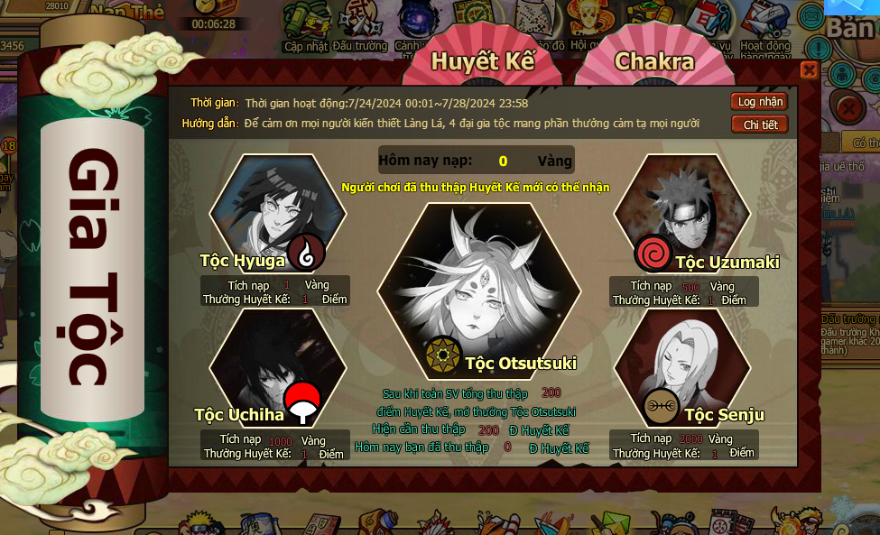 1. Trong thời gian hoạt động mỗi ngày tích lũy nạp đủ mốc tương ứng, mở 4 đại gia tộc, nhận thưởng Huyết kế tương ứng. 4 đại gia tộc gồm: Tộc Hyuga, Tộc Uzumaki, Tộc Uchiha, Tộc Senju.