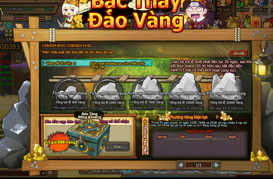 5. Trong thời gian event , nạp 1 lần đầu tiên thỏa nhận thêm bảo tàng khoáng . Trong thời gian , thống kê mức nạp của người chơi toan sv đến giải thưởng may mắn , Mổi nạp 1 Vàng giải thưởng tăng 1 Vàng , mỗi ngày 12:00, 18:00, 22:00 rút ngẫu nhiên 3 người chơi may mắn trong người chơi nạp thẻ toàn sv trả lễ Vàng