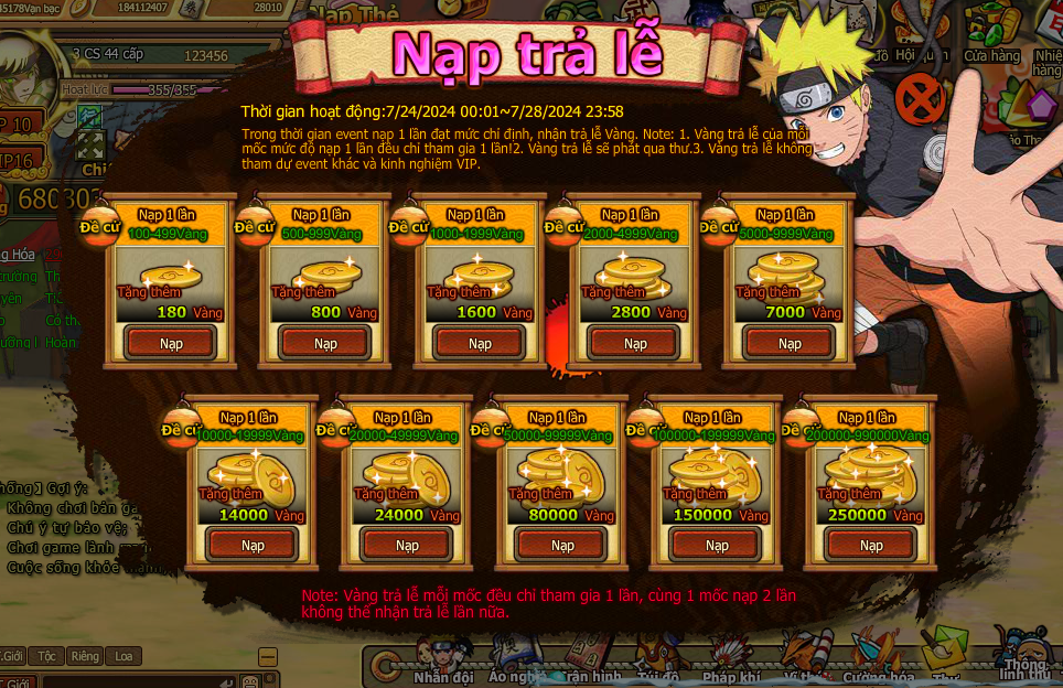 Trong thời gian event nạp 1 lần đạt mức chỉ định , nhận trả lễ vàng