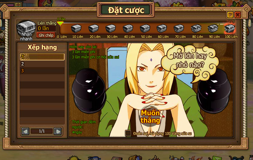 2. Thi đấu bắt đầu khi người chơi điểm số mình lớn hơn hay nhở hơn điểm của Tsunade, nhấn vào nút Lớn hoặc Nhỏ.