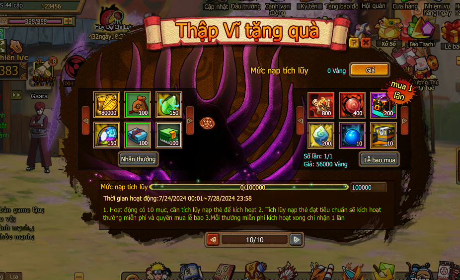 2. Sau khi nạp đủ mốc tương ứng, nhận thưởng Tộc Otsutsuki, nếu chưa nhận thưởng, không thể tăng số lượng Huyết Kế.