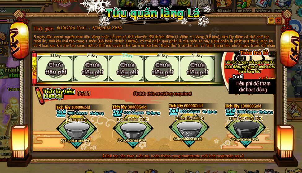 1. 5 ngày đầu event người chơi tiêu Vàng hoặc Lễ Kim có thể chuyển đổi thanh điểm ( 1 điểm = 1 vàng / lễ kim )
