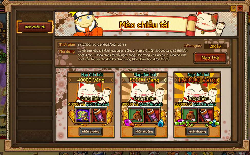 Lưu Ý : nạp 1 lần 200.000 vàng mới nhận cả 3 con mèo
