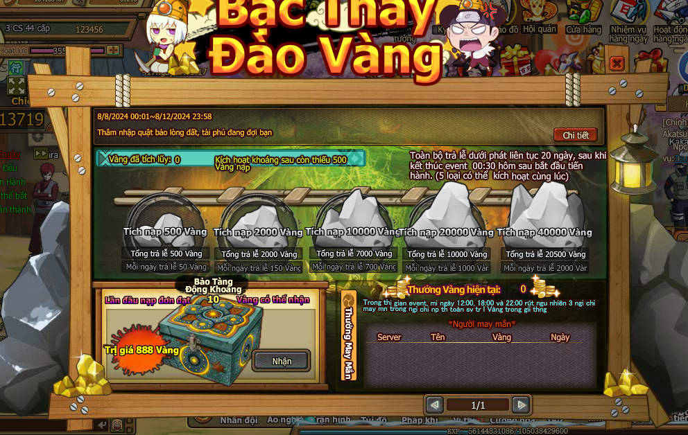 5. Trong thời gian event , nạp 1 lần đầu tiên thỏa nhận thêm bảo tàng khoáng . Trong thời gian , thống kê mức nạp của người chơi toan sv đến giải thưởng may mắn , Mổi nạp 1 Vàng giải thưởng tăng 1 Vàng , mỗi ngày 12:00, 18:00, 22:00 rút ngẫu nhiên 3 người chơi may mắn trong người chơi nạp thẻ toàn sv trả lễ Vàng