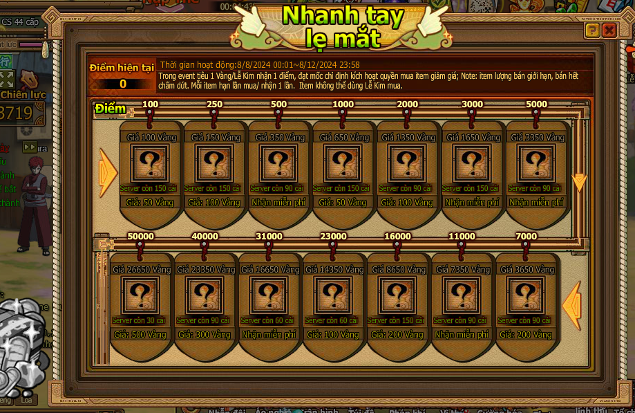Note : Trước và sau 15 phút thời gian phát thưởng , giải thưởng tạm không làm mới nữa . Mỗi người chơi trong thời gian event chỉ có thể tham dự 1 lần giải thưởng may mắn trả lễ Vàng.
