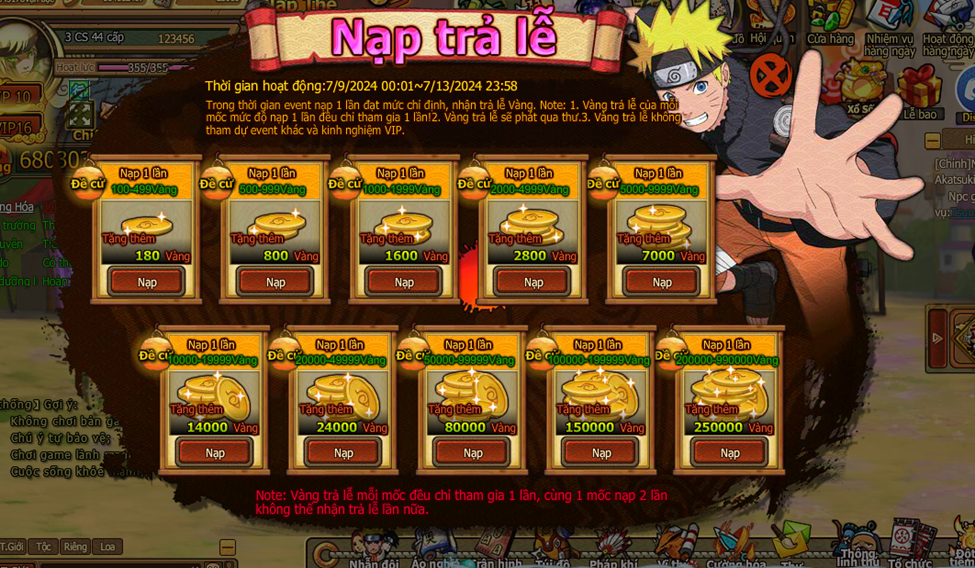 Vàng trả lễ của mỗi mốc mức độ nạp 1 lần đều chỉ tham gia 1 lần