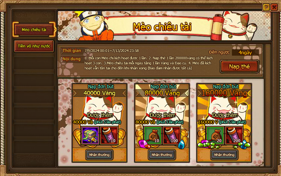 3. Mèo chiêu tài mỗi ngày tặng 1 lần Vàng và đạo cụ.