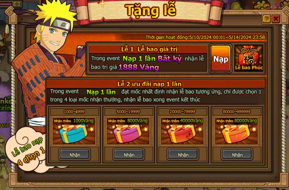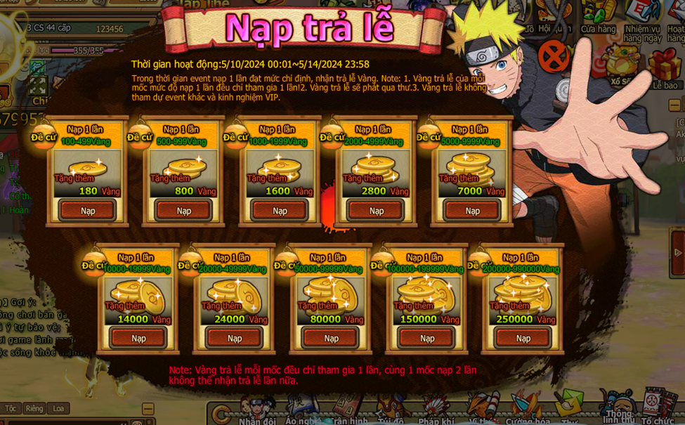 Trong thời gian event nạp 1 lần đạt mức chỉ định , nhận trả lễ vàng