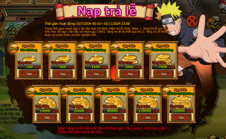 Trong thời gian event nạp 1 lần đạt mức chỉ định , nhận trả lễ vàng