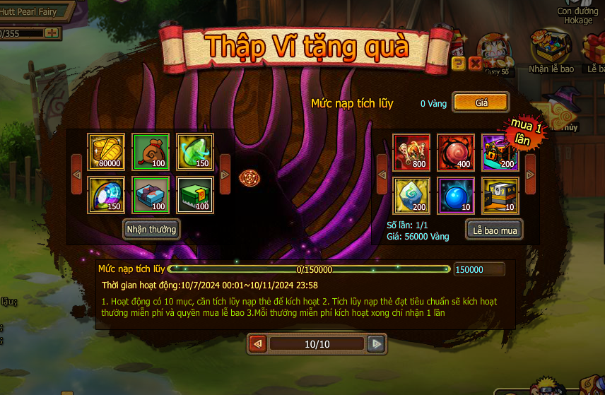 1. Hoạt động có 10 mục, cần tích lũy nạp thẻ để kích hoạt.