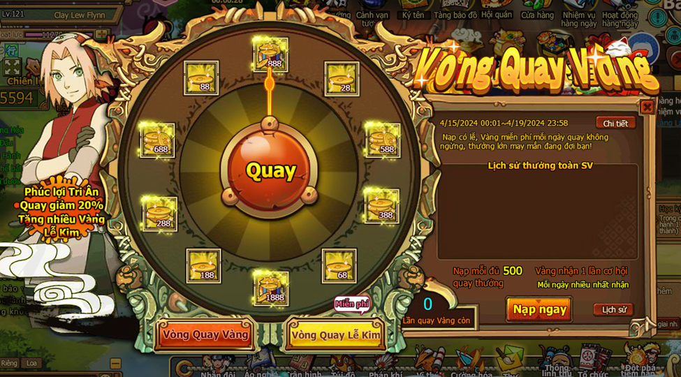 1. Trong thời gian event, người chơi nạp đủ 500 vàng nhận 1 lần cơ hội quay ( vòng quay vàng )