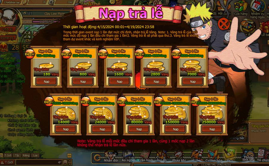 Vàng trả lễ của mỗi mốc mức độ nạp 1 lần đều chỉ tham gia 1 lần