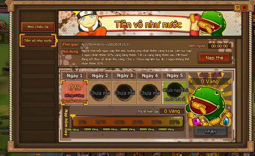 1. Người chơi mỗi ngày nạp thẻ mốc tương ứng nhận thêm vàng trả lại. Liên tục nạp 5 ngày nhận thêm 80% vàng tặng thêm. Tất cả vàng tặng thêm sau 24h hoạt động kết thúc sẽ nhận thủ công. Chú ý: Chưa nạp liên tục đủ 5 ngày không thể nhận thêm 80%.