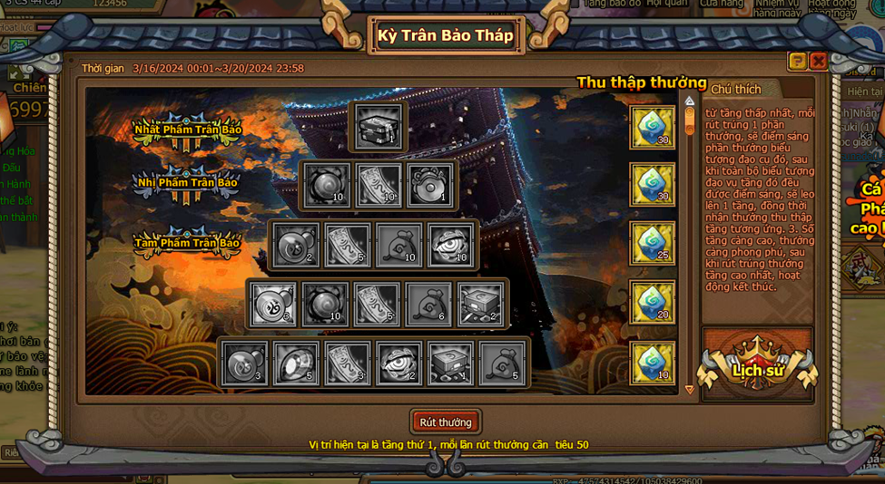 1. Từ tầng thấp nhất, mỗi rút trúng 1 phần thưởng, sẽ điểm sáng phần thưởng biểu tượng đạo cụ đó đều được điểm sáng, sẽ leo lên 1 tầng, đồng thời nhận thưởng thu thập tầng tương ứng.