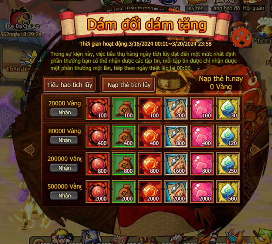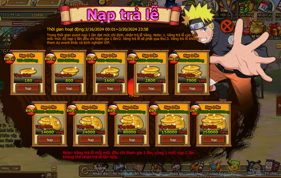 Trong thời gian event nạp 1 lần đạt mức chỉ định , nhận trả lễ vàng