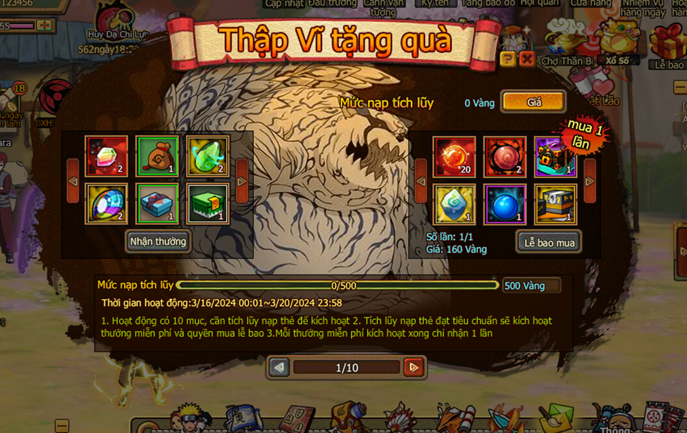 1. Hoạt động có 10 mục, cần tích lũy nạp thẻ để kích hoạt.