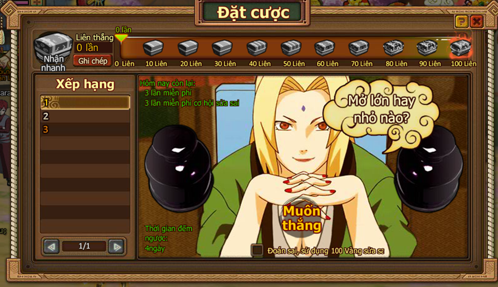 2. Thi đấu bắt đầu khi người chơi điểm số mình lớn hơn hay nhở hơn điểm của Tsunade, nhấn vào nút Lớn hoặc Nhỏ.