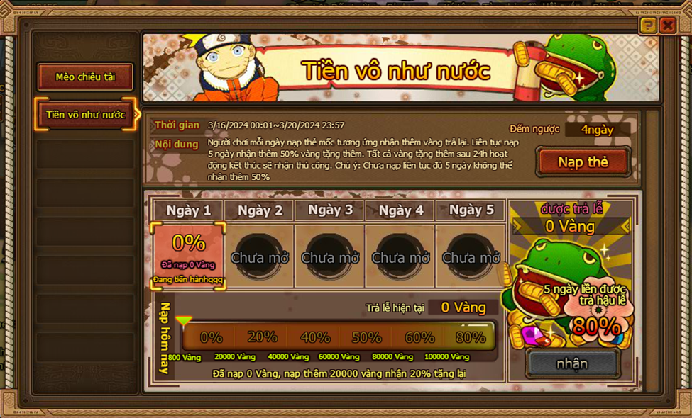 1. Người chơi mỗi ngày nạp thẻ mốc tương ứng nhận thêm vàng trả lại. Liên tục nạp 5 ngày nhận thêm 80% vàng tặng thêm. Tất cả vàng tặng thêm sau 24h hoạt động kết thúc sẽ nhận thủ công. Chú ý: Chưa nạp liên tục đủ 5 ngày không thể nhận thêm 80%.