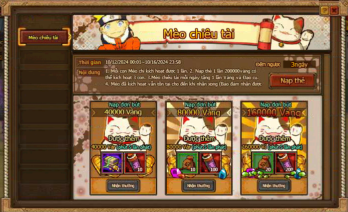 Lưu Ý : nạp 1 lần 200.000 vàng mới nhận cả 3 con mèo