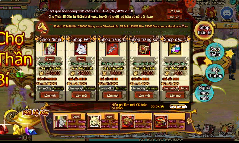 2. Trong chợ thần bí có 5 loại shop , phân biệt gồm shop ninja , shop pet , shop trang bị , shop trang sức và shop đạo cụ , mỗi shop đều bán loại vật phẩm tương ứng