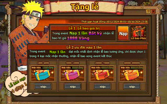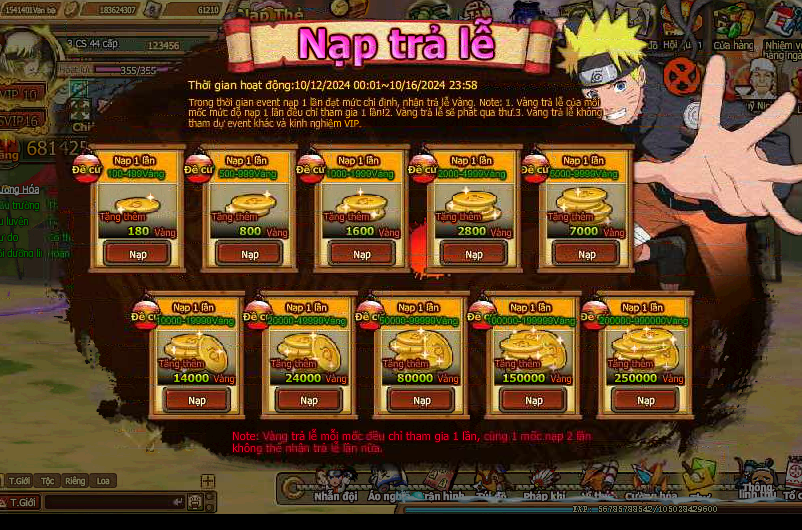 Trong thời gian event nạp 1 lần đạt mức chỉ định , nhận trả lễ vàng