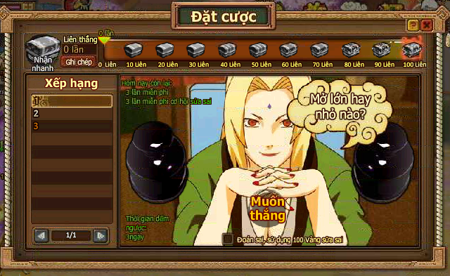 2. Thi đấu bắt đầu khi người chơi điểm số mình lớn hơn hay nhở hơn điểm của Tsunade, nhấn vào nút Lớn hoặc Nhỏ.