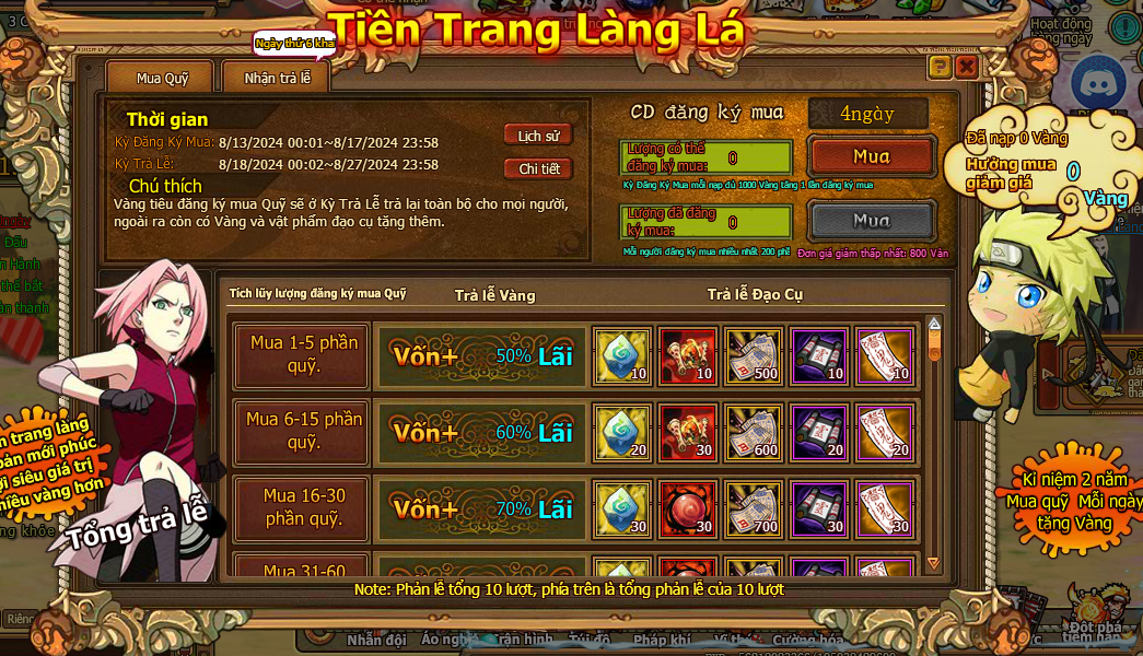 Người chơi căn cứ số phần mua Quỹ mỗi ngày nhận 1 lần Quỹ thưởng trả lễ , trả lễ bao gồm trả lễ vàng và đạo cụ