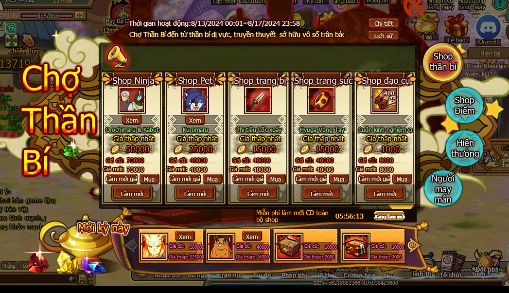 2. Trong chợ thần bí có 5 loại shop , phân biệt gồm shop ninja , shop pet , shop trang bị , shop trang sức và shop đạo cụ , mỗi shop đều bán loại vật phẩm tương ứng