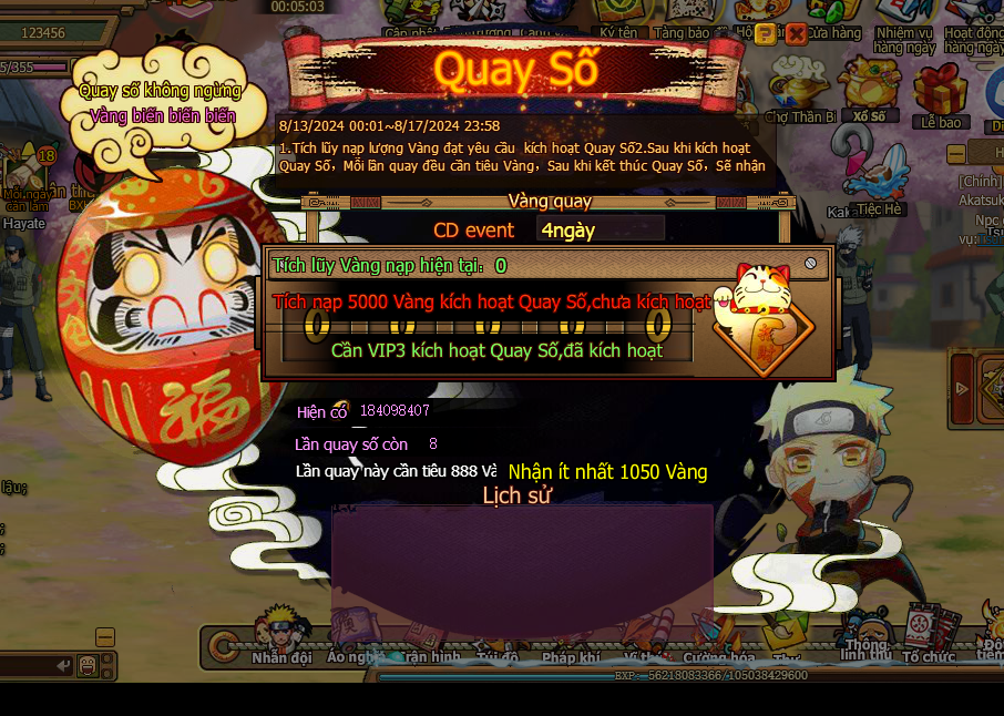 3. Trong thời gian event, người chơi tiêu đủ 1000 vàng nhận 1 lần cơ hội vòng quay lễ kim, mỗi ngày nhiều nhất có thể nhận 20 lần