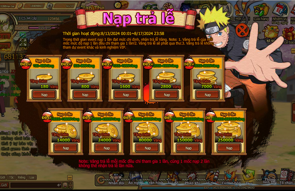 Trong thời gian event nạp 1 lần đạt mức chỉ định , nhận trả lễ vàng