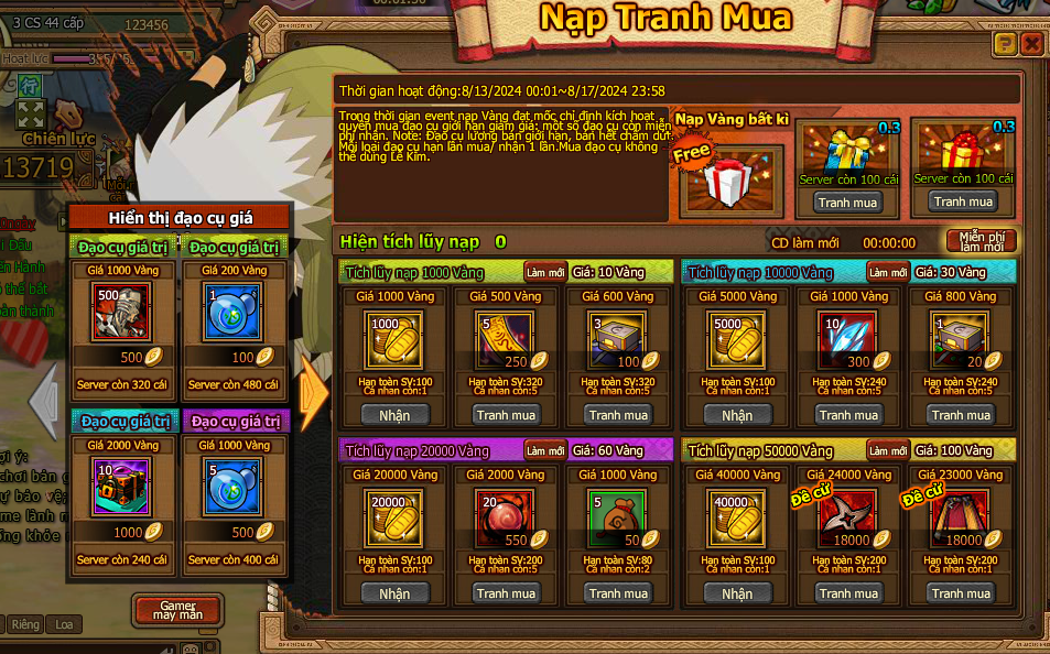 1. Trong thời gian event nạp Vàng đạt mốc chỉ định kích hoạt quyền mua đạo cụ giới hạn giảm giá: một số đạo cụ còn miễn phí nhận.