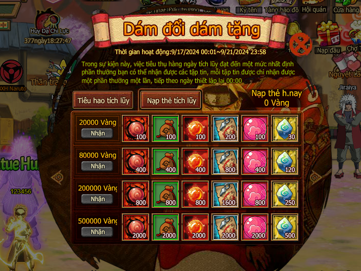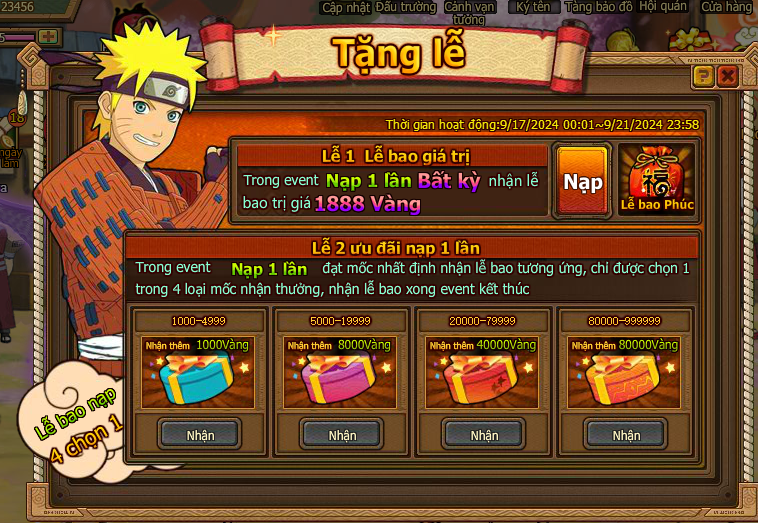 Trong thời gian event nạp 1 lần đạt mức chỉ định , nhận trả lễ vàng