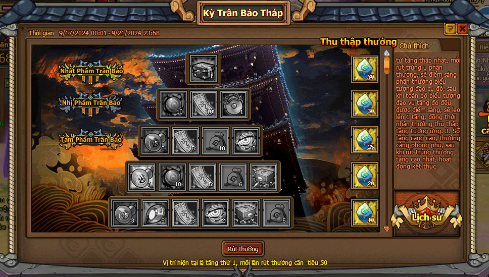 1. Từ tầng thấp nhất, mỗi rút trúng 1 phần thưởng, sẽ điểm sáng phần thưởng biểu tượng đạo cụ đó đều được điểm sáng, sẽ leo lên 1 tầng, đồng thời nhận thưởng thu thập tầng tương ứng.