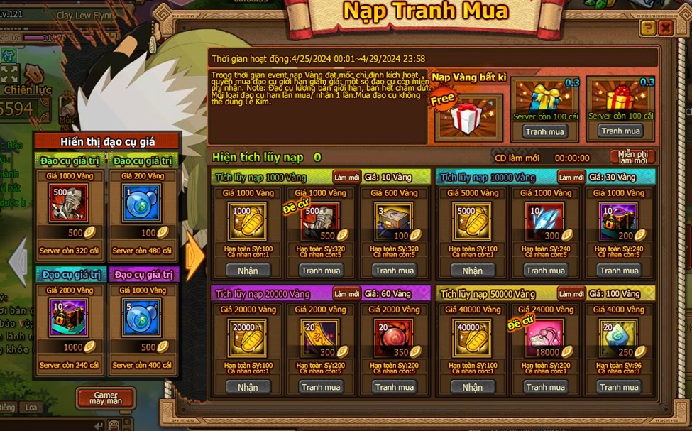 1. Trong thời gian event nạp Vàng đạt mốc chỉ định kích hoạt quyền mua đạo cụ giới hạn giảm giá: một số đạo cụ còn miễn phí nhận.