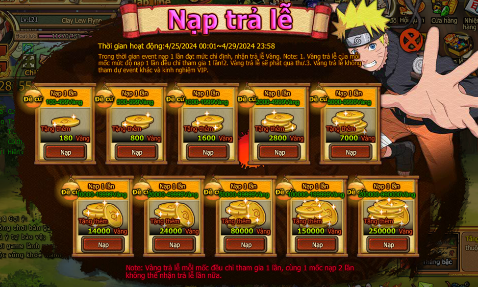 Trong thời gian event nạp 1 lần đạt mức chỉ định , nhận trả lễ vàng