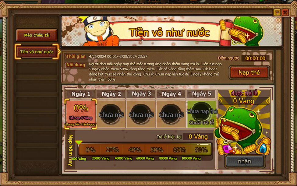 1. Người chơi mỗi ngày nạp thẻ mốc tương ứng nhận thêm vàng trả lại. Liên tục nạp 5 ngày nhận thêm 80% vàng tặng thêm. Tất cả vàng tặng thêm sau 24h hoạt động kết thúc sẽ nhận thủ công. Chú ý: Chưa nạp liên tục đủ 5 ngày không thể nhận thêm 80%.