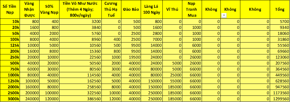 5. Trong thời gian event , nạp 1 lần đầu tiên thỏa nhận thêm bảo tàng khoáng . Trong thời gian , thống kê mức nạp của người chơi toan sv đến giải thưởng may mắn , Mổi nạp 1 Vàng giải thưởng tăng 1 Vàng , mỗi ngày 12:00, 18:00, 22:00 rút ngẫu nhiên 3 người chơi may mắn trong người chơi nạp thẻ toàn sv trả lễ Vàng