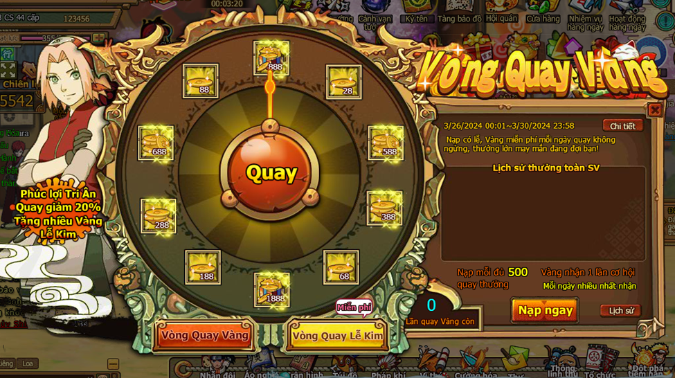 1. Trong thời gian event, người chơi nạp đủ 500 vàng nhận 1 lần cơ hội quay ( vòng quay vàng )