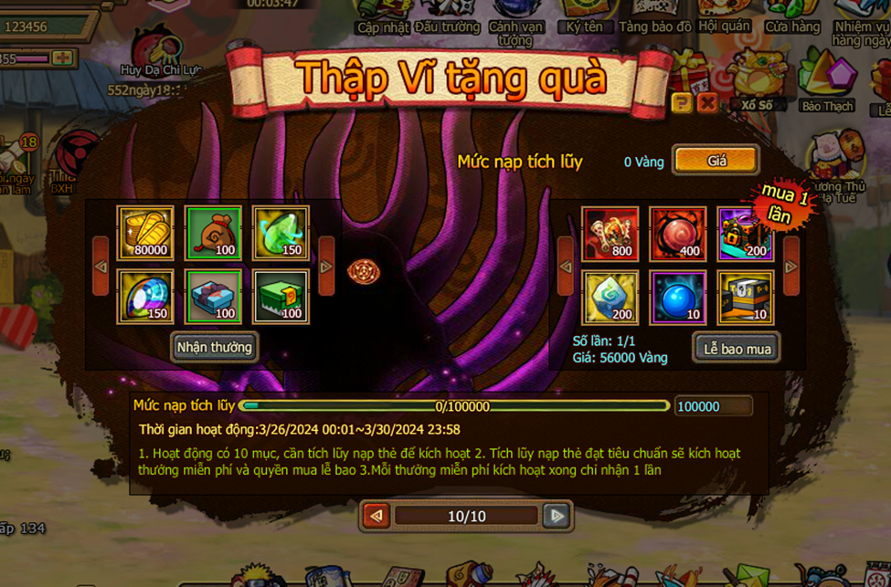 1. Hoạt động có 10 mục, cần tích lũy nạp thẻ để kích hoạt.